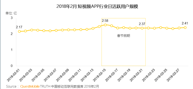 据第三方公司QuestMobile统计,今年除夕当天,短视频行业日活跃用户规模突破2.58亿,行业渗透率达到27.6%,且春节期间,在回家探亲访友,社交活动增多的情况下,短视频App日人均使用时长仍超60分钟。