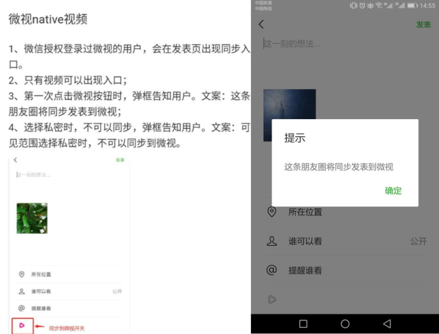 截图显示:第一次点击微视按钮时,弹框告知用户,会显示“这条朋友圈将同步发表到微视”,选择私密时,不会同步,会提示,“可见范围选择私密时,不可以同步到微视。”