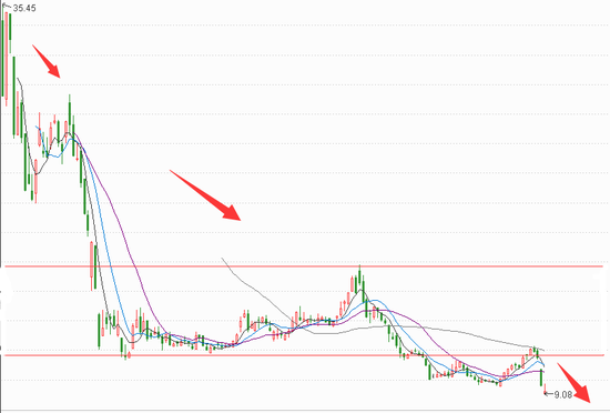 破发并暴跌后趣店股价一直萎靡不振。今年3月趣店曾有小幅升高,但无法突破压力线,随后阴跌不止。这种形态的股票明显缺乏上涨的动能,对积极的消息(例如业绩上涨)不敏感,而更容易受负面消息的刺激。