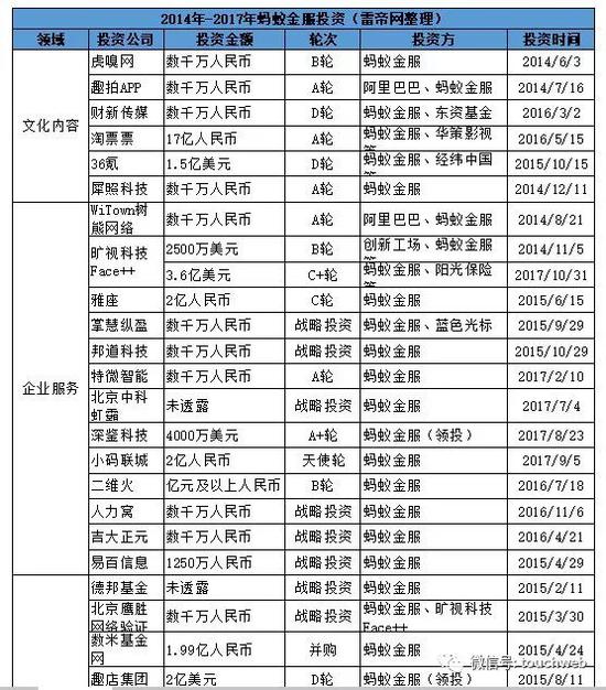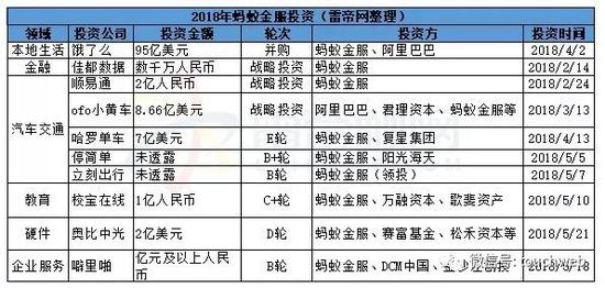 据雷帝网了解,蚂蚁金服近五年投了一百多家公司,覆盖出行、餐饮、教育、人力、财税、保险、货基、小贷、共享服务、智能支付等领域。
