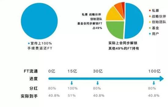 而且随着挖矿进度的进行,当FT流通量达到30亿时,分红比例将再次回调到80%,用户到手的分红会降低到40.8%。