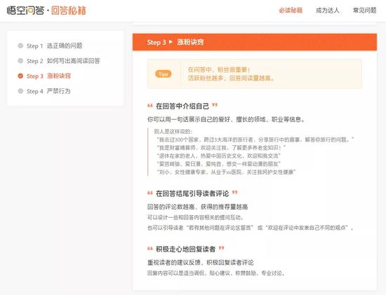 在界面右上角的显著位置是官方帮助文档,取名为“回答秘籍”,点开一看,介绍的是“如何写出高阅读回答”、“涨粉诀窍”、“不会获得阅读量的行为”。