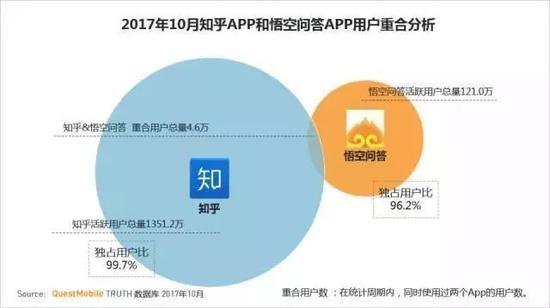 QuestMobile 去年 10 月数据显示,知乎 App 和悟空问答 App 重合用户不到 5 万,表现出明显的独占特征。