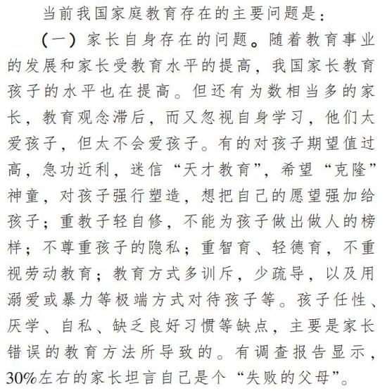这份报告介绍了很多发达国家包括美国、日本、法国、英国、新加坡等国家对家庭教育的重视和经验,而这些在中国是十分缺乏的。在我国,多年的应试教育让学校教育成为教育的中心,很多家长对于家庭教育的重视程度明显不足。而在家庭教育存在的诸多问题中,首当其冲的自然是家长自身的问题:
