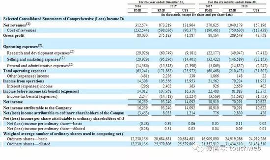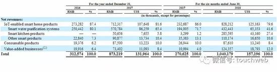 招股书显示,云米2016年、2017年营收分别3.12亿、8.73亿(1.31亿美元),云米2018年上半年营收10.4亿元(约1.57亿美元),上年同期为2.7亿元。