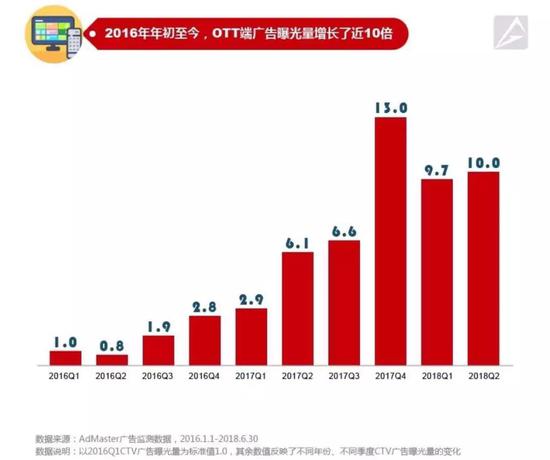 被广告主抛弃的电视端,正在重获青睐。AdMaster广告监测数据显示,2016年Q1到2018年Q2两年多时间里,OTT端广告曝光量增长近10倍。对比去年同期,2018年上半年OTT端广告份额增长了7.3%,增至12.2%,移动端只有3.6%的小幅上升,PC端则出现了下降,占比同比减少11.0%。三大媒体终端中,OTT端广告份额增幅最大。
