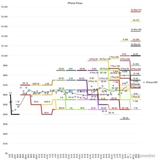 下面这张图是苹果各代 iPhone 的定价,你可以把它看做一个市场份额不断下降、但是价格不断上涨的故事。