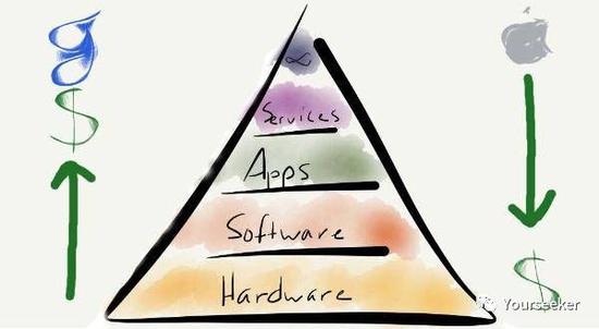 苹果是自上而下赚钱,它的核心是这张图的底层——硬件。苹果在服务和应用上投入的所有资源都是为了帮助硬件产品制造差异。也是出于这个原因,苹果的所有服务和应用只能出现在自己的设备上。