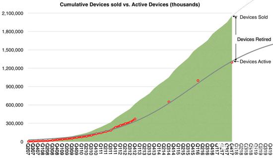 下面这张图是 2007 年 iPhone 推出以来苹果公司销售设备数的累积值。截至 2018 年初,苹果总计卖出 20.5 亿台设备。我们如果考虑产品寿命的影响,用总销售设备数减去已经退休和不活跃的设备数之后,会有一些新发现。