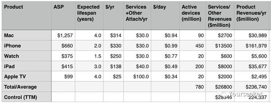 上表中第一列是产品类型,第二列是平均售价(ASP),第三列是产品预期寿命,第四列是用户每年在产品上的支出。