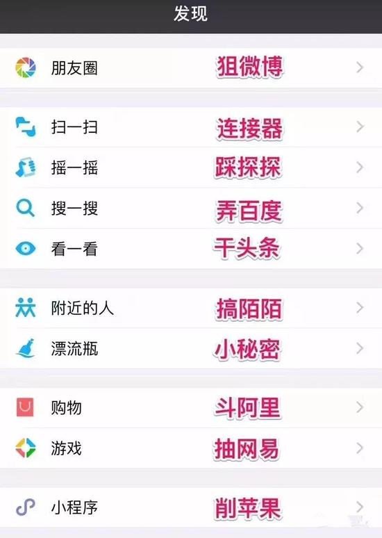当微信公布要做搜一搜、看一看的时候,曾流传一张微信干翻全场的趣图,图片可能有夸大的嫌疑,但微信火力全开的话,以一当百也不是没有可能,这也反映出外界对微信的恐惧。