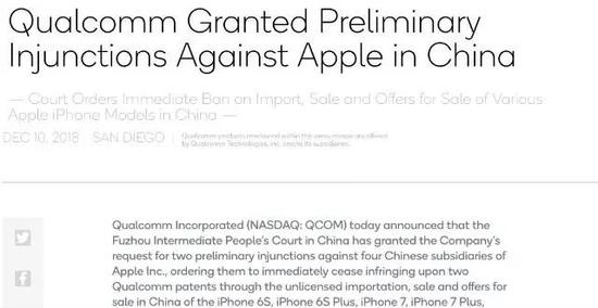 北京时间12月10日晚间,高通对外宣布,福州中级人民法院已经通过了高通针对苹果四家中国子公司提出的两个诉中临时禁令,要求他们立即停止针对高通两项专利的、包括在中国进口、销售和许诺销售未经授权的产品的侵权行为。