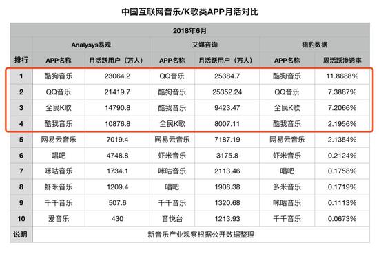这种顺利,是建立在TME无可匹敌的市场优势上的,从各种报告的数据都可以看到,TME旗下四大服务酷狗音乐、QQ音乐、酷我音乐和全民K歌用户量在互联网音乐整体市场上稳居前四,而且遥遥领先。
