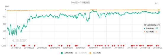Soul App的榜单数据表现虽然不错,但其实一直在社交榜单高位徘徊,很少能进入top5,总榜也很少进入top30。