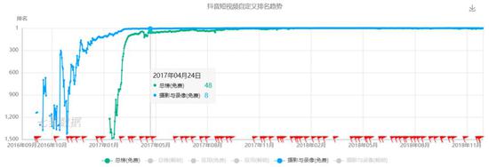 再比如抖音,抖音从2017年3月小岳岳转发开始为众人所知(其实仔细看榜单时间,实际投放增长的时间要略早于小岳岳微博转发),初步一个月左右的时间里的表现其实也略逊于目前的音遇。