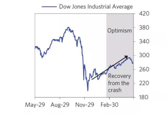 到了1930年,许多人认为股票市场50%的调整已经结束,开年的四个月市场开始反弹。当时没有看到公司盈利的下滑,许多公司变得便宜。到了3月,美联储降低利率到3.5%,5个月内下调利率2.5%。到了3月25日,国会又通过了两个铁路基建项目,将带了1%的GDP增长。大部分经济学家认为,财政刺激将带来经济的增长。银行业到了1930年初,又开始进行扩展。道琼斯到了4月10日反弹到了290点以上。在我们的去杠杆初期,许多人都会低估经济衰退的严重性,这时候的经济政策往往不足够。