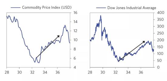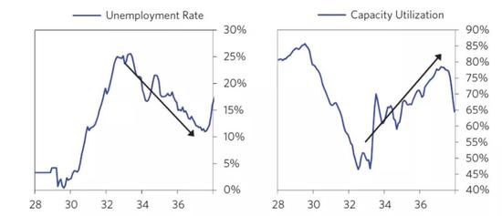 到了1932年后期,美国国内失业率达到了25%。而这一次大萧条也导致了全球的保护主义崛起,进而引发了后来的战争。在德国,希特勒在选举中获胜。1931年日本入侵东三省,1932年入侵上海。美国国内也引发了大规模的民粹主义。之后几年,第二次世界大战将全面爆发。在危难时刻,老罗斯福当选美国总统,将美国总大萧条中真正拯救了出来。下图我们看到,在罗斯福当选的时候,美国失业率达到了惊人的25%,通缩也是在10%的水平。从投资时钟看,是最差的宏观经济基本面。