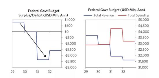 在衰退中我们会看到这个经典矛盾。政府刺激是一个明显的应对措施。然而当你的支出减少,你的收入也在减少。经济衰退时,政府收入减少,也没有钱用来做刺激政策。下图我们看到的是美国政府财政赤字的变化。