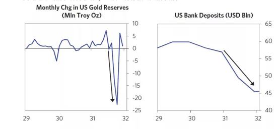 由于黄金从美国大幅流出,为了吸引投资者,美联储又开始了加息之路。在1931年10月9日,美联储加息1%,从1.5%提高到了2.5%。一周以后继续加息1%,提高到了3.5%。当时的美联储主席私下要求法国不再从美国撤资,将黄金保留在美国国土。由于美国政府开始兑换黄金和现金,又导致了新一轮的银行被挤兑。由于存款比例下滑,银行不得不召回他们的贷款。大量普通老百姓被迫拍卖房子和农场,以应对银行的要求。下面这张图我们看到了美国黄金储备的月度变化,以及银行存款的大幅下滑。