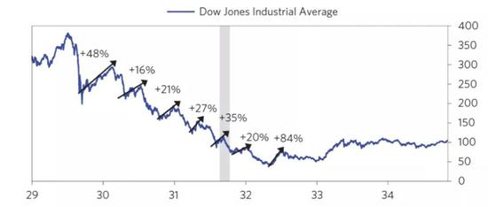 以美元计价的资产形成了一次完整的危机,初期政府的干预手段效果不大。美国进口出现了大幅的下滑,在这个过程中,反而推动美元走强。这个过程事实上在2008年金融危机中也出现过。如果我们看下面这张图,看到在大萧条过程中,道琼斯指数出现了多次20%以上的反弹。不过每一次反弹都是带来更大幅度的下跌。