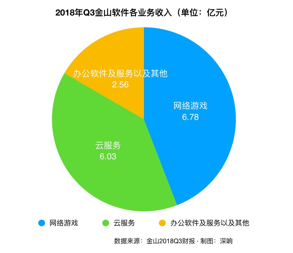 图片来自金山2018半年报根据金山最新的2018Q3财报,云和网络游戏的收入不相上下,办公软件的收入相比而言绝对值要小于其他两者。