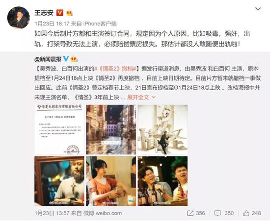 微博大V@王志安,就在一条相关新闻下转发并留言:“如果今后制片方都和主演签订合同,规定因为个人原因,比如吸毒,强奸,出轨,打架导致无法上演,必须赔偿票房损失。那估计都没人敢随便出轨啦!”