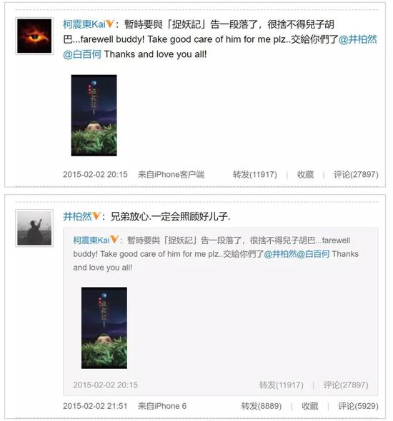 微博内容称:“暂时要与‘捉妖记’告一段落了,很舍不得儿子胡巴……Farewell buddy! Take good care of him for me plz @井柏然 @白百何 Thanks and love you all!”