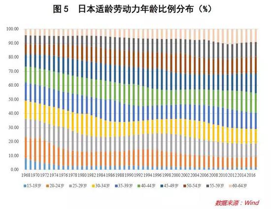 可是,纵然人力资本红利再怎么有效,只要是人,终究还是会老去。事实上,日本适龄劳动力内部的年龄结构已经出现了老化趋势。按照日本统计局的数据,2017年,日本适龄劳动力中50岁以上的人口所占比重为31.59%,而该指标在1968年是17.86%。与之相应的是,30岁以下的劳动力占比,已经从1968年的36.33%下降到2017年的18.65%(参见图5)。这也就意味着在不久的将来,日本65岁以上的老年人只会更多。
