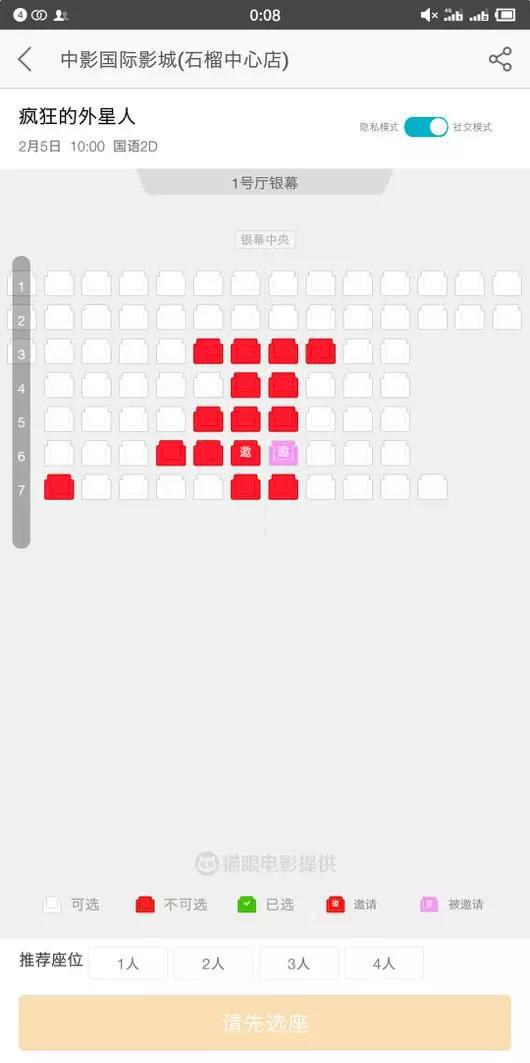 你单身,想去看《地球最后的夜晚》,但身边的朋友听说很烂都不愿同往,个别感兴趣的或者时间对不上,或者早已陪男朋友看过,亦或者你身边本就没有适合一起看文艺片的朋友……于是你打开美团,点开晚上7点场的电影选座页面,看到有一红一紫两个相邻座位,你点击红色座位,资料显示邀请人是26岁的单身男性;你点击紫色座位,显示邀请对象为20~30岁的女性,于是24岁的你点击了接受邀请,140分钟里,你们前后只说了不到10句话,也未必会发生更多故事,但兴许此后再也不用忍受一个人进入影院时那种似有若无的微妙心酸……