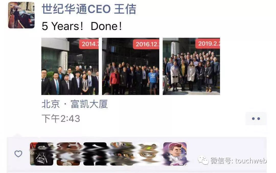 世纪华通CEO王佶晒出2014年到2019年的3张照片,并发表感言:“5 yeas! Done。”