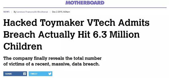 2015年11月,玩具制造商vTech宣布它的数据泄露影响了全球20万名儿童。几天后,它新发布的报告称实际上有超过630万名儿童的信息被泄露。