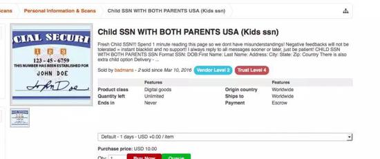 相关报道称,儿童数据买卖第一次出现2016年初。在一个暗网市场上,有人将儿童社会安全号码(美国社会安全卡上的 9 位数字)和父母信息捆绑销售,售价低至10美元。由于影响范围较小,这在当时的市场上并没引起波浪。