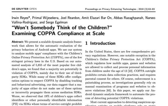 根据国际计算机科学研究所在18年的一份研究报告《没人想到孩子吗(Won’t Somebody Think of the Children?)》,市面上起码有过半Android 应用,涉嫌违反了《儿童在线隐私保护法案》(COPPA)。