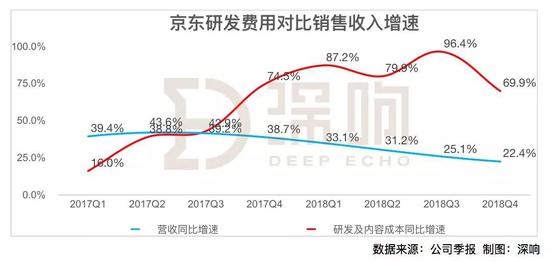 根据财报数据,京东在2018年的技术投入高达121亿元,其同比增速在全年四个季度中均超过70%,在2018年Q3更是高达历史最高的96%。