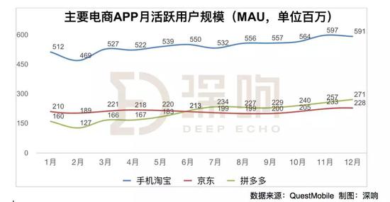 根据QuestMobile的数据,截至2019年1月14日,手机淘宝的MAU(月活跃用户)规模遥遥领先,而京东则在去年7月被电商新贵拼多多实现弯道超车,且呈现持续拉大趋势。而在DAU(日活跃用户)和APP下载量上,拼多多对于京东也实现全面超越。