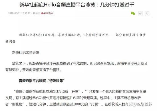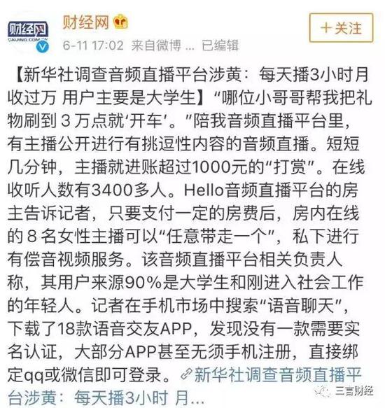 据新华社原文:“记者在一个名为陪我的音频直播平台里发现,有主播通过电台功能公开进行有挑逗性内容的音频直播。过程中,主播不断怂恿收听者“刷礼物”。短短几分钟,主播就进账超过1000元的“打赏”。在线收听人数有3400多人。”