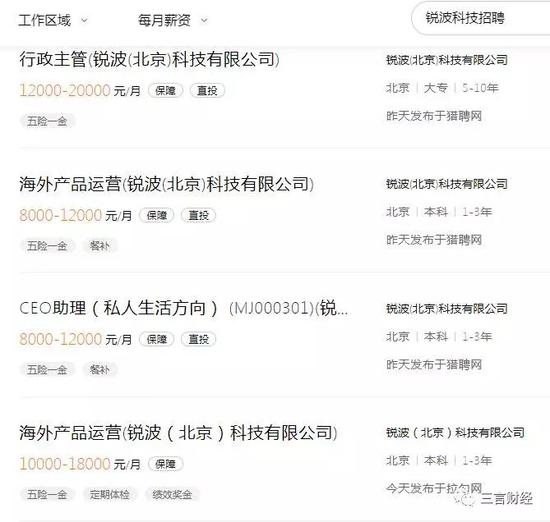 此外,三言财经搜索发现,孙宇晨任CEO的锐波(北京)科技有限公司近日仍在北京地区进行招聘,相关的职位包括游戏策划、海外产品运营、CEO助理、行政主管、区块链工程师等。