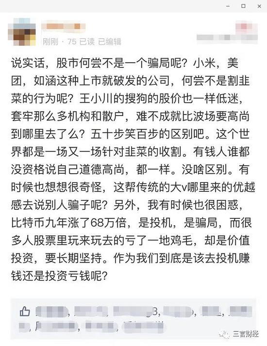 同时,网上也存在着这样一种声音,认为股市和币市一样都是骗局,小米、美团、如涵上市即破发亦是割韭菜的行为。搜狗也是股价低迷,王小川并没有比孙宇晨高尚到哪里去。这样的言论得到了一些人的认同。