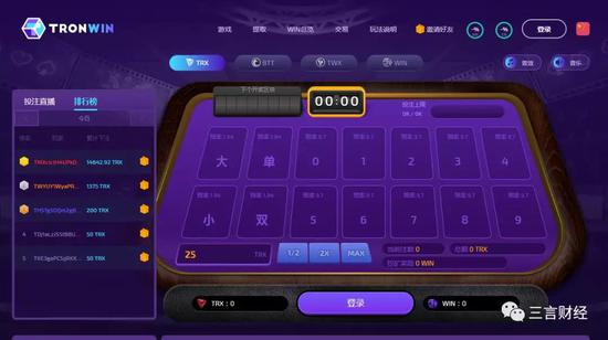 排在第三的TronWin则提供多种线上赌博业务。在其中一类的记录中可以看出,一位用户下注已超过14000TRX,按现在市价计算价值3000多元。