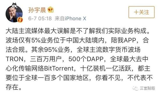 今日,孙宇晨发微博称,大陆主流媒体因为不了解波场实际业务构成,对其存在误解。