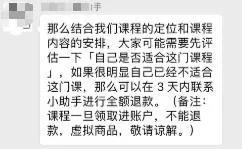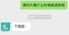 根据学习助理的要求,只要在课程领取、打卡前三天申请退群,是可以退还99元入群入群学费。然而退群之后,她却总迟迟拿不到退费,无论如何催促,学习助理在回信息时都只是承诺:下周退款。