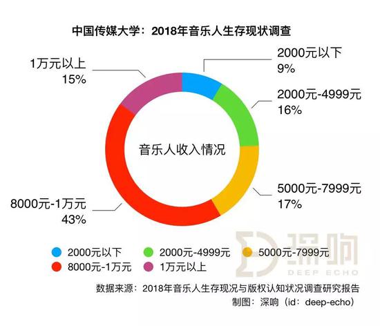 中国传媒大学音乐与录音艺术学院发布的《2018年音乐人生存现况与版权认知状况调查》报告显示,中国有三成音乐人收入为零,近七成音乐人从事兼职工作,95%的音乐人都无法仅靠音乐收益维持生计。