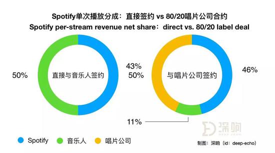 根据海外媒体的数据,相比于和唱片公司合作,Spotify直接与音乐人合作,单次播放所产生的分成中,Spotify可以多分到4%。