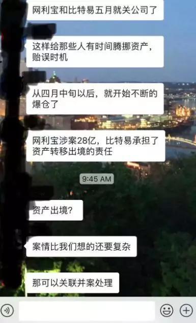 这只能说明,让惠轶自杀的,一定是卷入了比3000BTC更大金额的暴雷事件,让他无法承受。最大可能就是近期涉案超30亿元、爆雷的P2P平台“网利宝”。根据一张流传甚广但出处不明的截图,比特易被指承担了“网利宝”腾挪资产、转移出境的任务。
