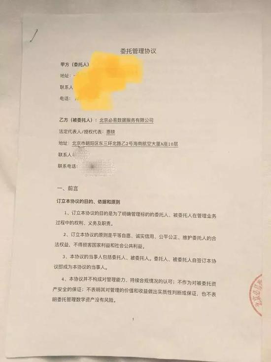 一位经王直办理过签约的安徽投资者给区块律动BlockBeats看了他与比特易的《委托管理协议》,上面写着该协议不作为对委托资产安全的保证,不表明对其管理的价值作出实质性的判断或保证。