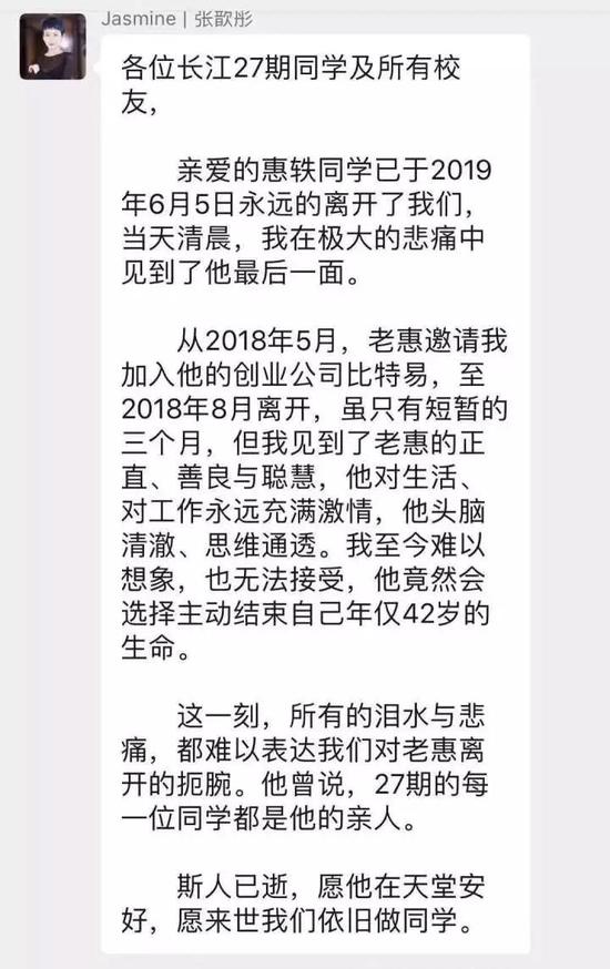 关于惠轶自杀的最初消息源头是长江商学院EMABA学员、原比特易合伙人张歆彤在微信群发的一条消息。根据爆料,惠轶是6月5日凌晨,在比特易的新办公室,以自缢的方式自杀。当员工10点来上班发现时,已无力回天。