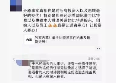 一位向比特易投资了数百个比特币的投资者也透露出比特易的其他股东正在和惠轶本人撇清关系,他表示“真是让逝者寒心,让投资者寒心。老惠轻生这种做法,不敢苟同,比特易的股东和员工这种甩锅的做法更让人感到厌烦。”