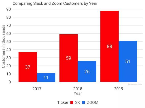 Slack2017年的收入1.05亿美元,2018年2.21亿美元,2019年4.01亿美元(财政年度而非自然年,Slack的算法是当年1月31日结束)。Zoom的收入分别为6100万美元、1.51亿美元和3.31亿美元。