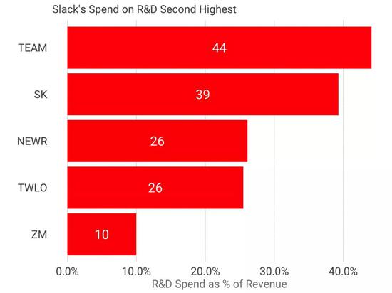 从数据看,Slack把39%的收入花在研发上(1.56亿美元),而Zoom则是10%(3300万美元)。一个额外信息是,Zoom雇佣了1000名员工,Slack员工数1500人。