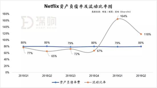 受居高不下的内容制作成本影响,Netflix在2019年二季度末资产负债率仍维持在80%的较高水平,而短债务比虽然较上个季度的164%有所下降,但仍然超过100%,这说明在二季度末,Netflix账面流动资产不足以偿付短期流动负债,偿债风险仍然较高。